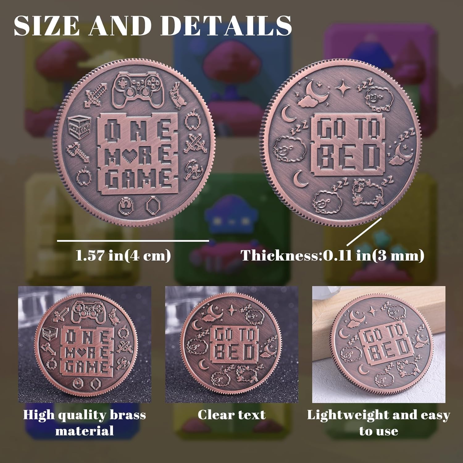 Introducing the One More Game Coin, the perfect blend of humor and practicality for any gaming enthusiast. This double-sided coin, featuring “One More Game” on one side and “Go To Bed” on the other, brings a delightful twist to those tough decisions—between another round of gaming or calling it a night.