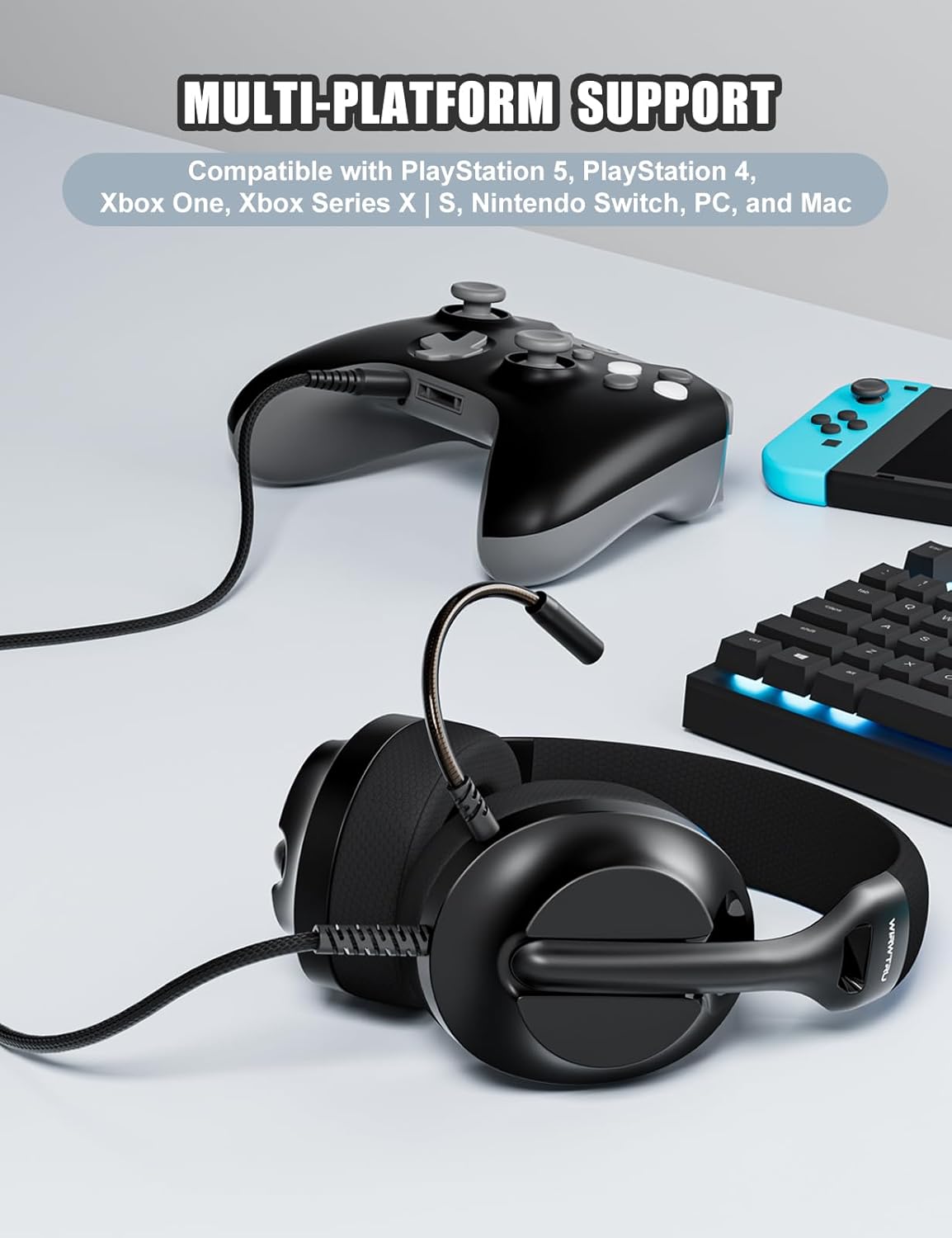 These gaming headsets are an excellent option for those looking for quality at a good price. The design is lightweight and comfortable, ideal for long gaming sessions without causing discomfort. The ear cushions are soft and fit well in the ear, effectively isolating outside noise.The noise-cancelling microphone works very well, as voices are heard clearly in online games without interference. Furthermore, they are widely compatible: they work perfectly on Xbox, PS4, PS5, Switch, and PC, making them quite versatile.
