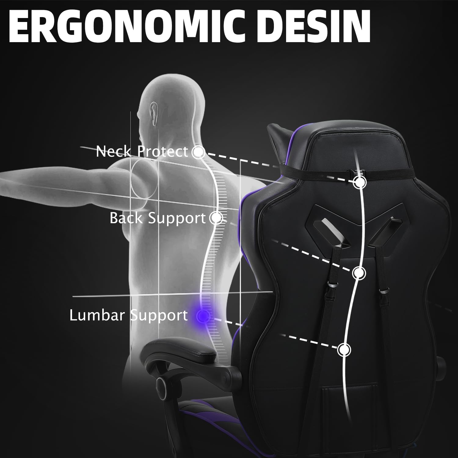 Our gaming chair boasts an adjustable headrest to alleviate neck strain and an advanced pocket spring cushion. Crafted for gamers of all body types, our ergonomic design promotes a natural sitting posture, allowing you to change positions freely. Stretch out, cross your legs, or lie back—enjoy the freedom of movement without sacrificing comfort.