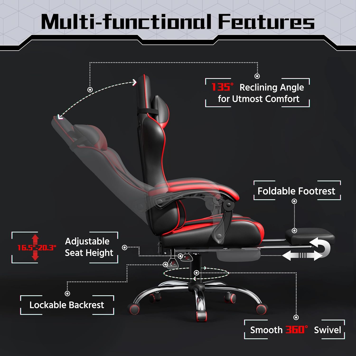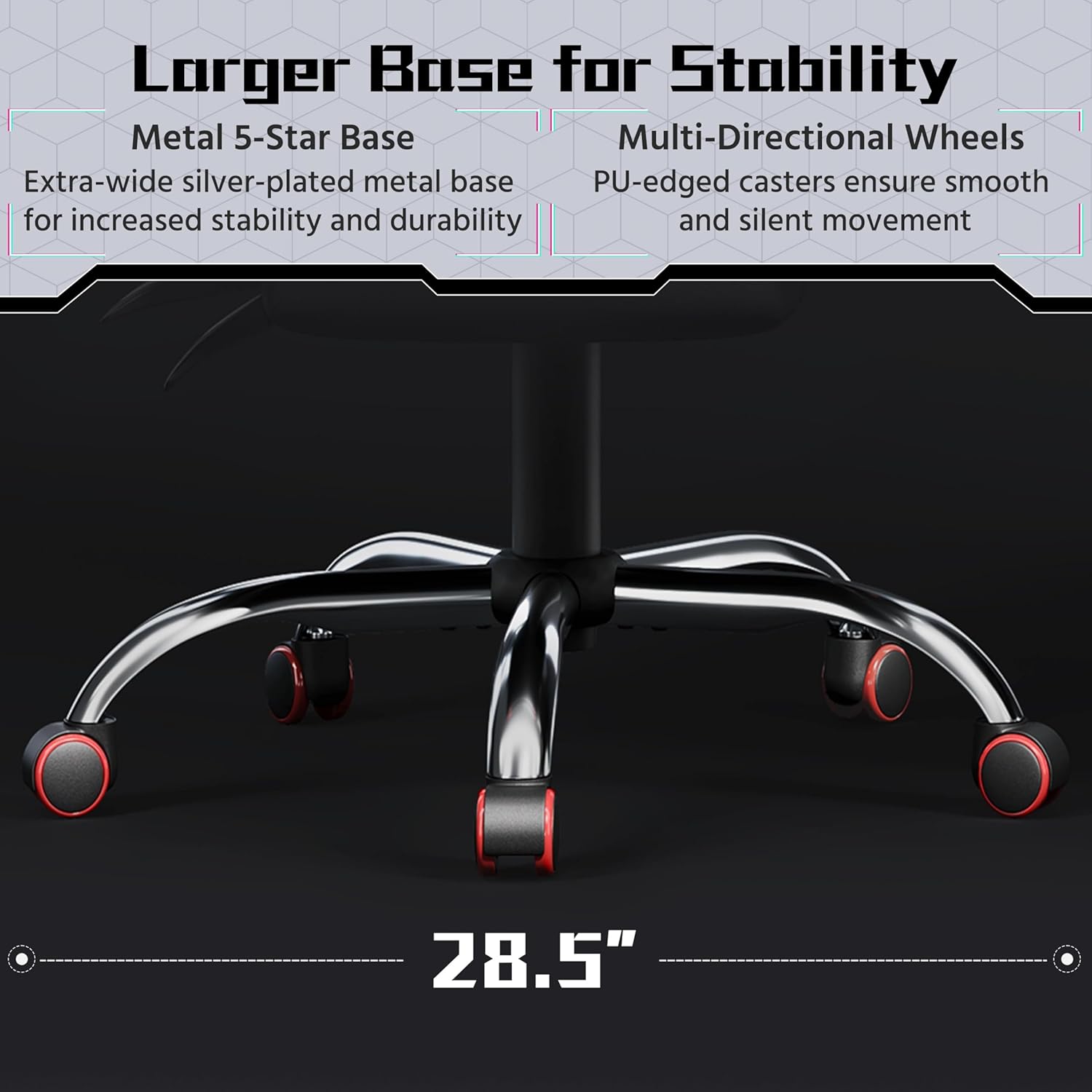 Engineered with a robust steel frame and a 28.3″ diameter electroplated metal star base, this chair supports a weight capacity of up to 300 lbs. The SGS-certified gas lift allows for smooth and secure height adjustments, making it a dependable choice for gamers of all sizes. -