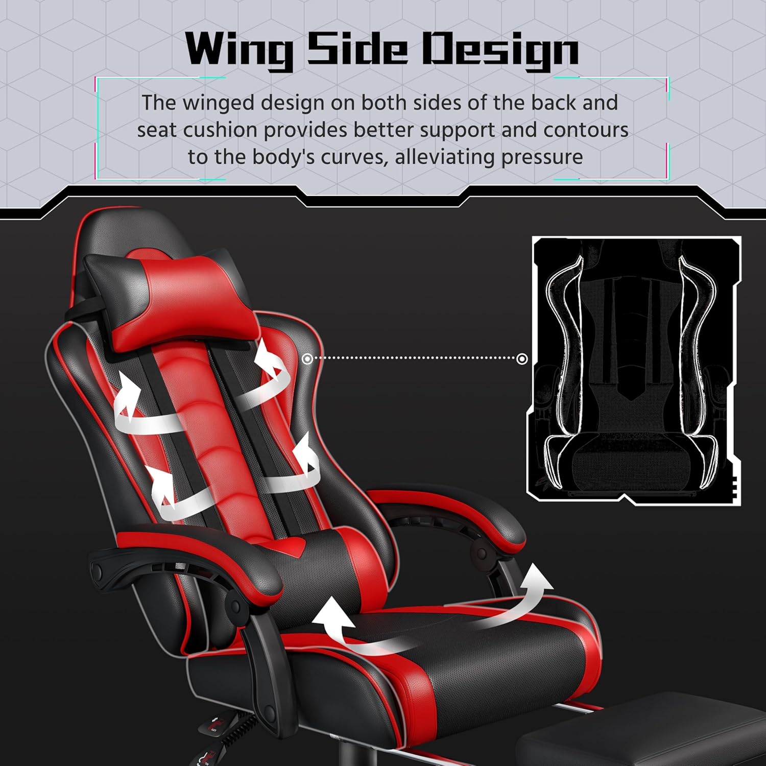 Say goodbye to fatigue with our innovative massage lumbar pillow, powered by a convenient USB switch. Extend the cushioned footrest to indulge in unmatched comfort during those long gaming marathons. Plus, keep small items and cables organized in the handy back pocket. -